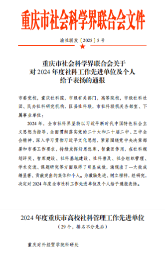 近日,重庆市社会科学界联合会发布《重庆市社会科学界联合会关于对2024年度社科工作先进单位及个人给予表扬的通报》(渝社联发〔2025〕5号),我校科研处荣获2024年度重庆市高校社科管理工作先进单位。