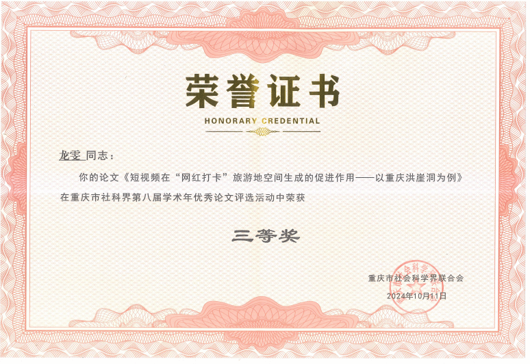 近日,重庆市社科联公布了《关于对重庆市社科界第八届学术年活动优秀论文和组织单位给予表扬的通报》,并对获得第八届学术年活动优秀论文作者和先进组织单位颁发了荣誉证书和奖牌。