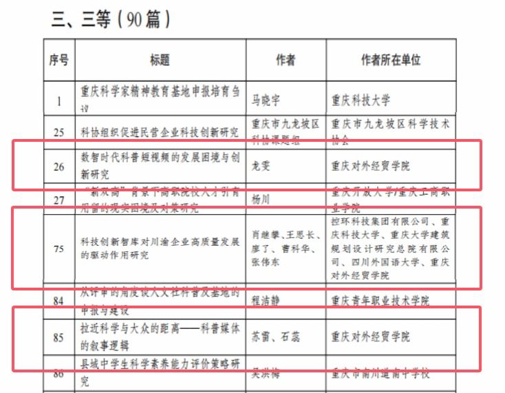 我校任晓珠老师撰写的《重庆科协系统以“党建+科建”互促新模式助推新质生产力发展》获得二等,该论文聚焦科协系统党建与科建的深度融合机制,为推动新质生产力发展提供了具有实践价值的路径探索。苏雷、石蕊老师合作完成的论文《拉近科学与大众的距离——科普媒体的叙事逻辑》、龙雯老师的论文《数智时代科普短视频的发展困境与创新研究》、张伟东老师参与撰写的论文《科技创新智库对川渝企业高质量发展的驱动作用研究》都获得了三等。此次获奖不仅是对我校教师学术能力的肯定,也彰显了学校在科研创新与社会服务领域的积极探索。学校将以此次佳绩为契机,进一步激励广大教师深耕学术研究,推动科研成果转化,为相关领域发展贡献更多智慧力量。