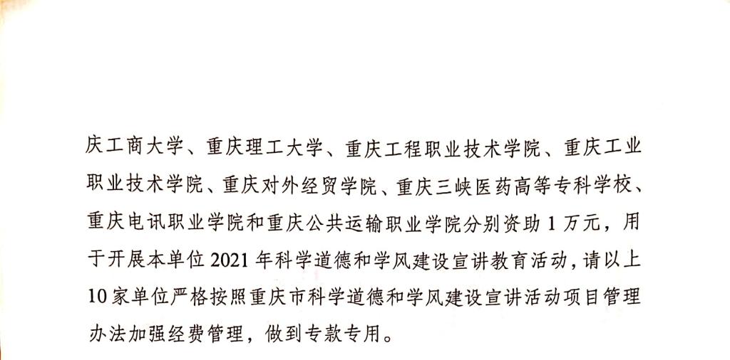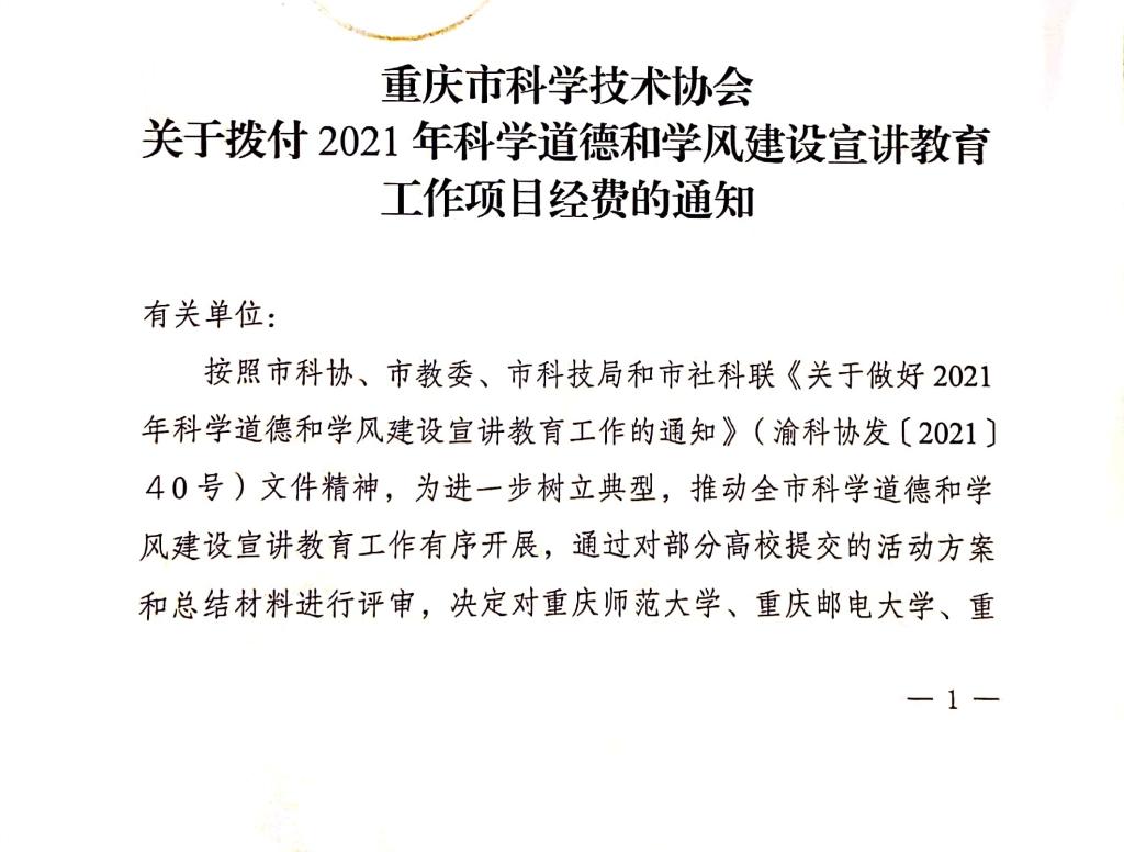 根据重庆市科学技术协会、重庆市教育委员会、重庆市科学技术局、重庆市社会科学界联合会《关于做好 2021年科学道德和学风建设宣讲教育工作的通知》,我校制订了《科学道德和学风建设宣讲教育工作方案》,按照“全覆盖,常态化,重实效”的工作要求,克服疫情影响,稳步有序地开展科学道德与学风建设宣讲教育活动。