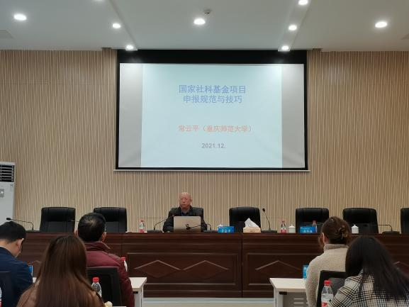 2021年12月16日我校举办了 “国家社科基金申报规范与技巧”讲座,特邀重庆师范大学常云平教授作专题辅导报告。杜斗恒副校长、科研处、各学院分管科研负责人、科研秘书;校级社科类科研平台、区级人文社科研究中心(创新中心)、拟申报2022年度国家社科基金项目的教学科研人员等90余人参加了本次讲座。