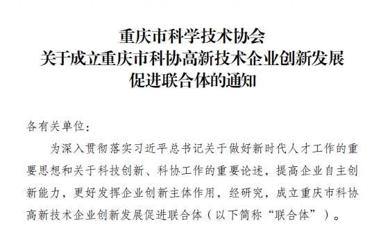 2022年12月21日,为全面贯彻落实市委深改办重庆市打造全国地方科协综合改革示范区实施方案(2021—2025年),重庆市科协高新技术企业创新发展促进联合体成立,我校成为首批创建成员单位。