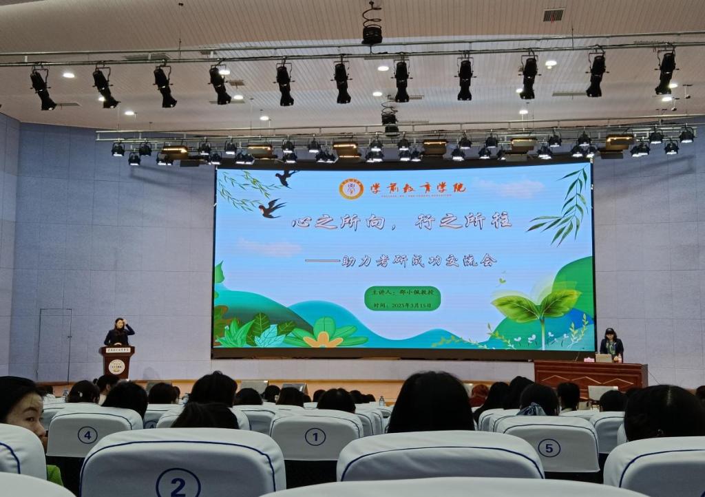 为帮助同学们深入了解考研的具体事项,尽早掌握考研备考的技巧,进一步促进学院学生对考研相关信息的了解。同时,为帮助大家进行有针对性的科学分析、提出有效指导策略,学前教育学院于2023年3月15日在9101学术报告厅开展了“助力考研成功交流会”专题讲座。讲座特邀重庆师范大学教育科学学院邵小佩教授主讲,学院副院长(主持工作)刘娜、副院长许雪梅、办公室主任周路、教学秘书徐依凡、各科任教师以及学院学生代表参加了本次讲座。