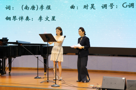 音乐舞蹈学院院长王婕为全院师生的学习演唱作示范、作表率,现场掌声阵阵。