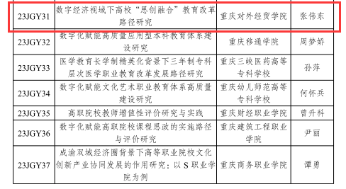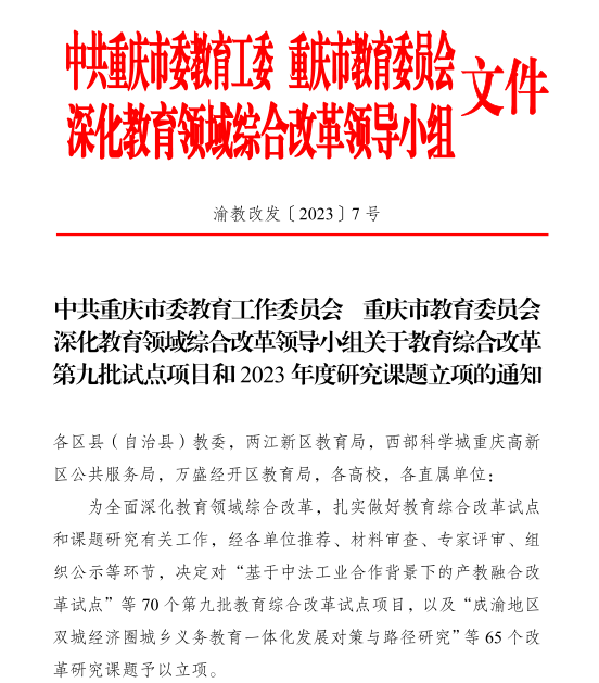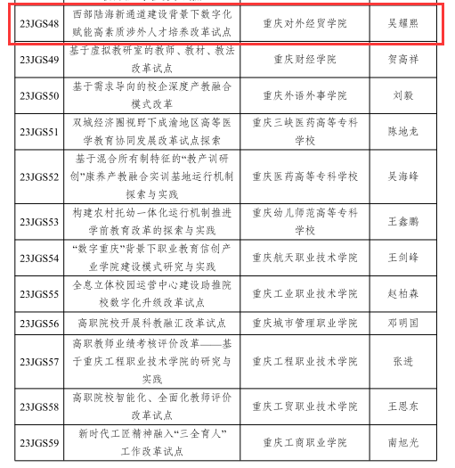 近日,重庆市教育委员会公布了《关于教育综合改革第九批试点项目和2023年度研究课题立项的通知》(渝教改发〔2023〕7号),我校吴耀熙老师《西部陆海新通道建设背景下数字化赋能高素质涉外人才培养改革试点》获批重庆市第九批教育综合改革试点项目立项,张伟东老师《数字经济视域下高校“思创融合”教育改革路径研究》获批2023年度教育综合改革研究课题立项。