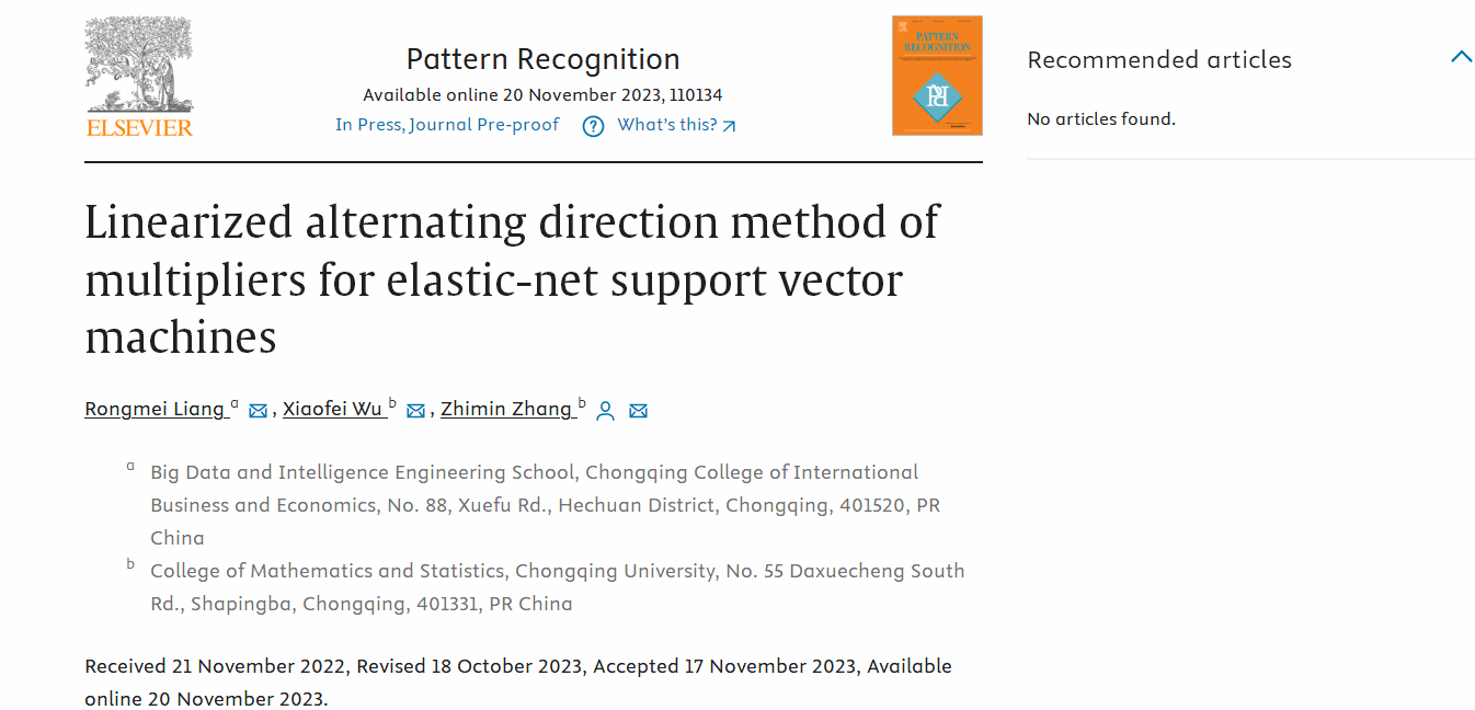 近日,在学校领导的大力支持下,我校大数据与智能工程学院梁荣梅老师与重庆大学吴小飞博士,张志民教授合作的论文《Linearized Alternating Direction Method of Multipliers for Elastic-net Support Vector Machines》,已被SCI一区国际顶级期刊《Pattern Recognition》(IF=8.0)收录。梁荣梅老师为论文第一作者,我校为第一通讯单位!该论文的发表说明学校对于科研工作的鼓励措施是卓有成效的,促进了学校良好的科研氛围,助力了高水平专业学科的建设。