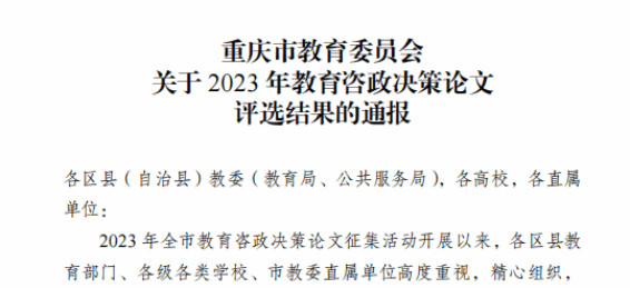 近日,重庆市教育委员会公布2023年教育咨政决策论文评选结果,学前教育学院马啸老师教育咨政决策论文《健全“家庭幼儿园社会”合作共育机制的建议》获一等奖。