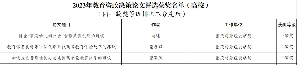 2023年全市教育咨政决策论文评选中,我校共三篇咨政决策论文获奖,教学质量督导与评估办公室童春燕《教育信息化背景下深化新时代高等教育评价改革的建议》、学前教育学院张双凤《加快推进普惠性民办幼儿园高质量教育体系的建议》同时获二等奖。