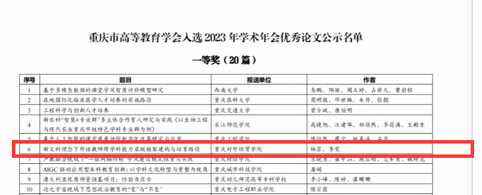 日前,重庆市高等教育学会公布了2023年学术年会优秀论文获奖名单,林芸、李霓老师的《新文科理念下外语教师跨学科能力层级》入选学会2023年学术年会优秀论文一等奖!