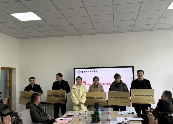 李川校长助理为包进、李霓、王杨丽、许雪梅等老师颁发“拔尖青枝科研人才”证书。王婕校长助理为合川区 HarmonyOS 端云协同创新中心、合川区影视传播与媒体融合协同创新中心、合川区数实融合应用场景协同创新中心、合川区区块链协同创新中心、合川区应用数学协同创新中心进行授牌。