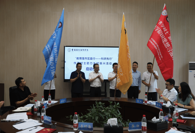 博士后工作会上举行了“教育强市区县行——科研先行”作孚村士助力乡村振兴活动启动仪式,合川区人力资源和社会保障局、西南大学农学与生物科技学院和博士后科研工作站主要领导为“作孚村士助力乡村振兴活动”授旗。