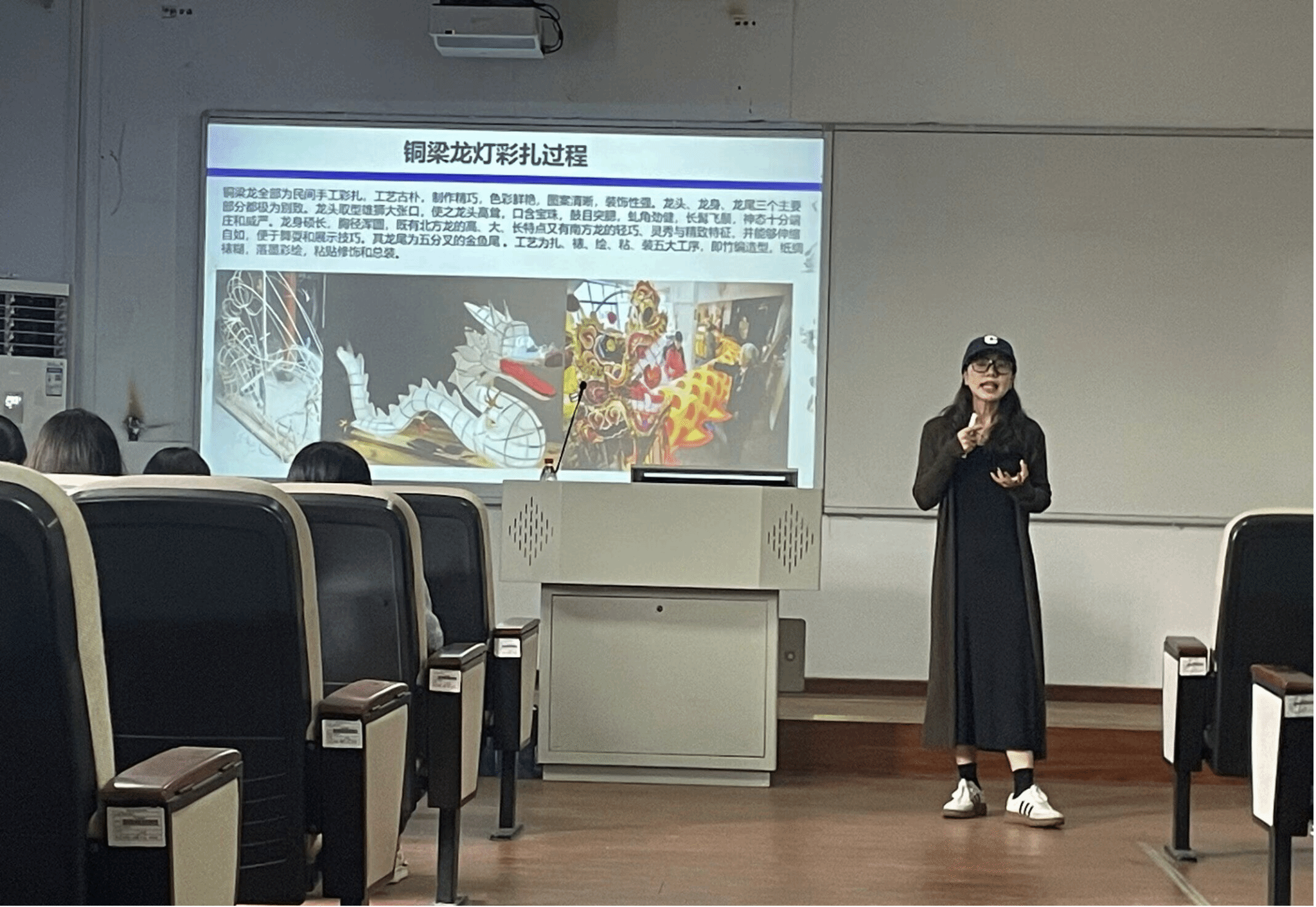 活动邀请到了李凤老师和李亚星老师作为主讲嘉宾,分别就非遗的实践与理论方面进行了精彩纷呈的讲解。李凤老师则为我们讲解了具体的非遗传承之一——铜梁龙,生动展示出非遗技艺的独特魅力,让同学们深刻感受到铜梁龙文化的厚重底蕴。李亚星老师从理论层面深入剖析非遗文化的价值与意义,为大家提供了全面深入的理解视角。两位老师的讲解相辅相成,为同学们心中种下了一颗非遗传承的种子。