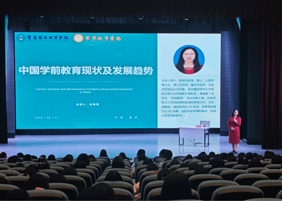 2024年10月17日下午,学前教育学院在A校区小剧场顺利开展以“中国学前教育现状及发展趋势”为主题的讲座。特邀重庆师范大学国际汉语文化学院院长牟映雪教授作为主讲嘉宾。泰国玛丽薇学校研学教师团队、合川区新华幼儿园教师代表,以及学前教育学院师生共同聆听本次讲座。