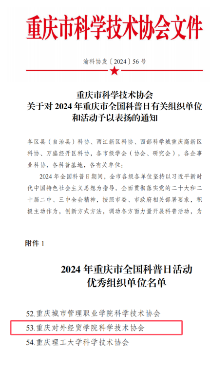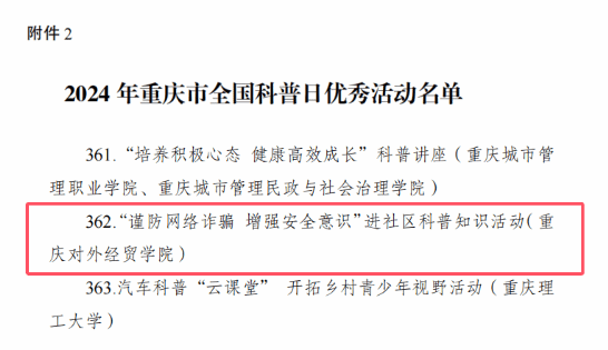 近日,重庆市科学技术协会公布了2024年重庆市全国科普日优秀组织单位、优秀活动名单,我校荣获“2024年重庆市全国科普日活动优秀组织单位”表彰,学校“谨防网络诈骗 增强安全意识”进社区科普知识活动获得“2024年重庆市全国科普日优秀活动”表彰。